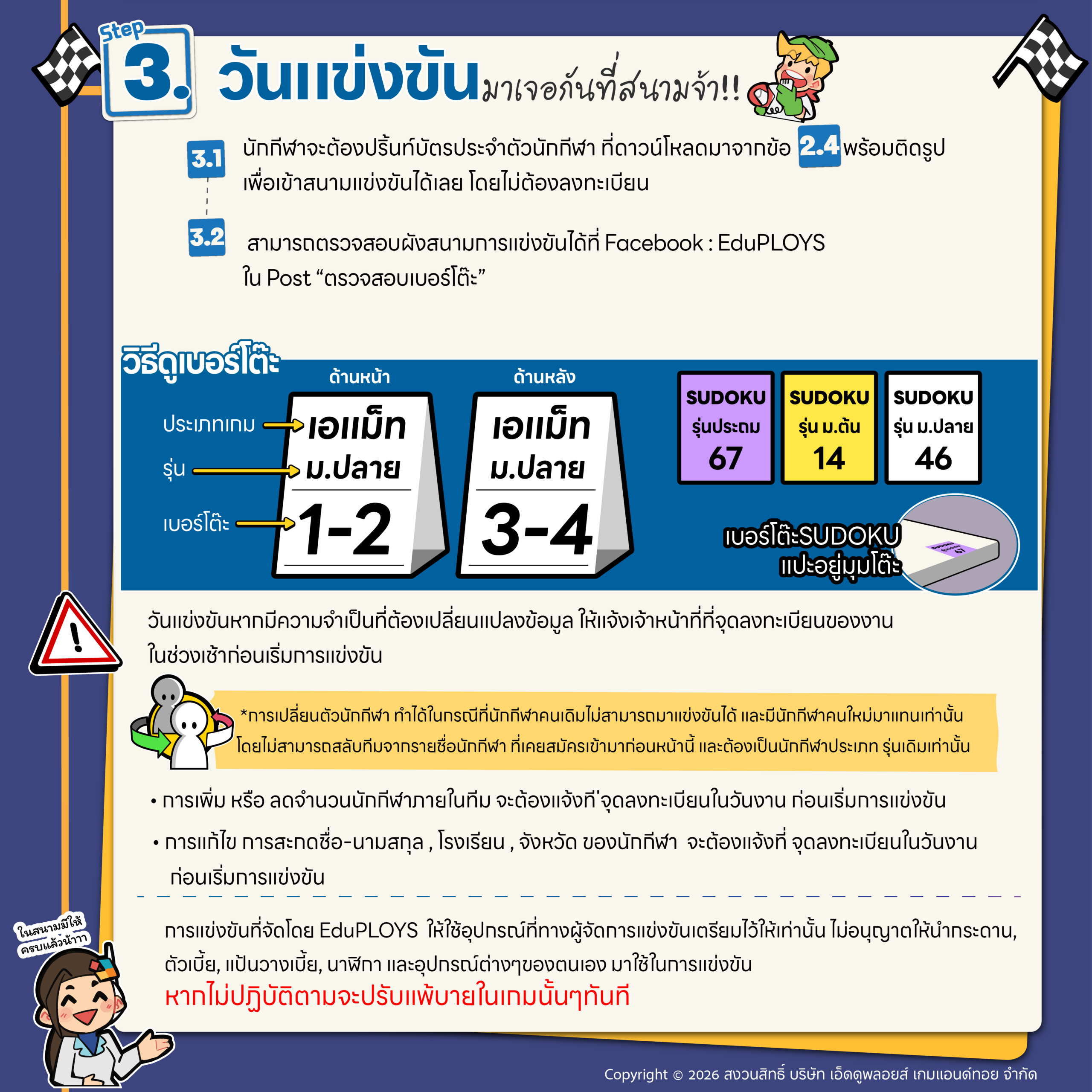 ลิงก์ ตรวจสอบเบอร์โต๊ะและดาวน์โหลดบัตรประจำตัวนักกีฬา : https://edsport.eduploys.com/