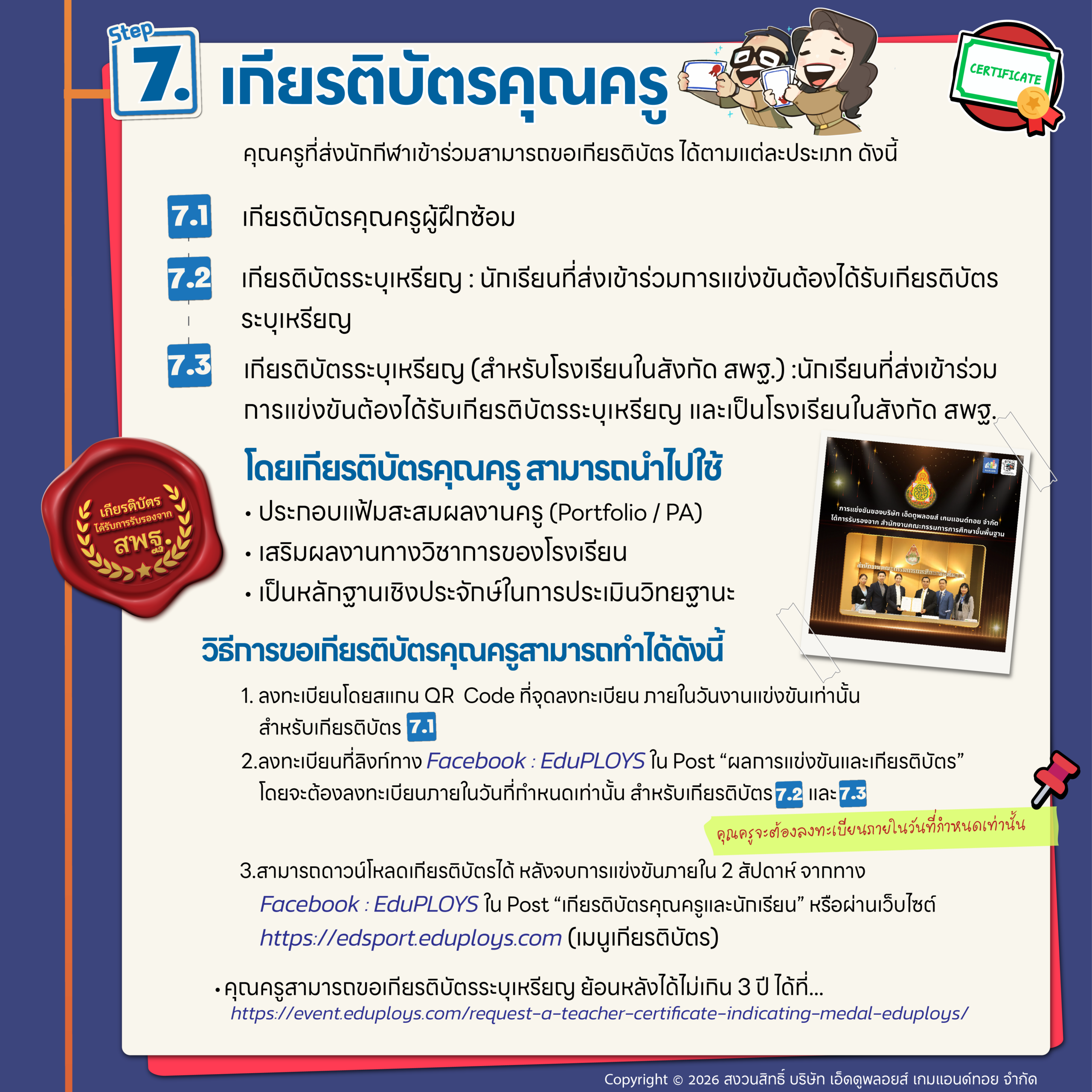 ลิงก์ ขอเกียรติบัตรคุณครู ระบุเหรีญ ย้อนหลัง ไม่เกิน 3 ปี : https://event.eduploys.com/request-a-teacher-certificate-indicating-medal-eduploys/